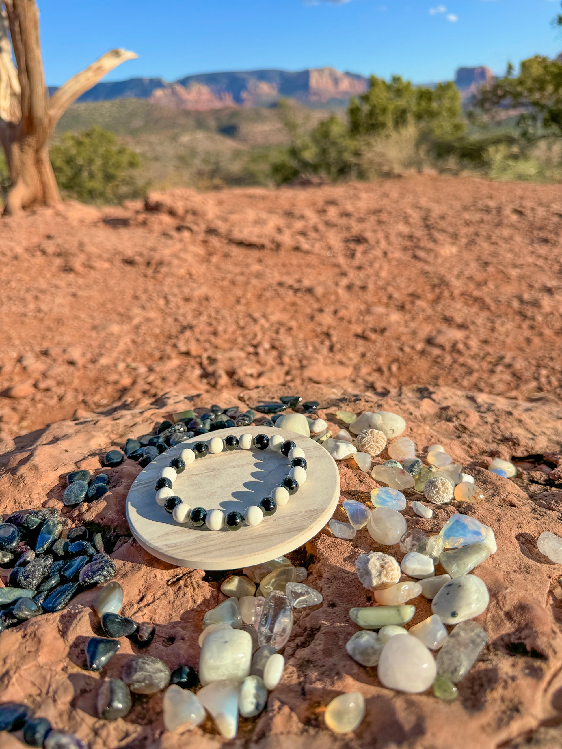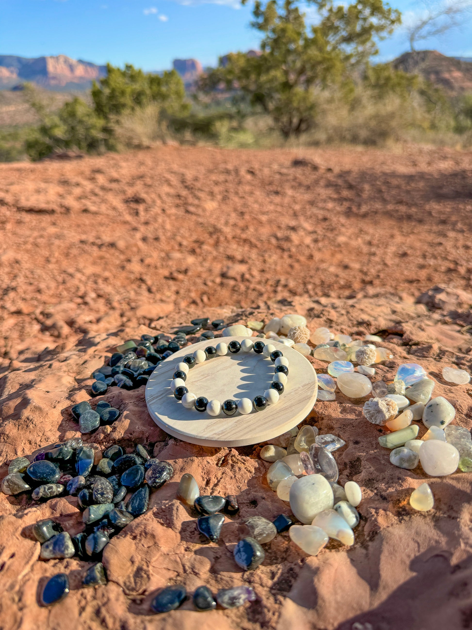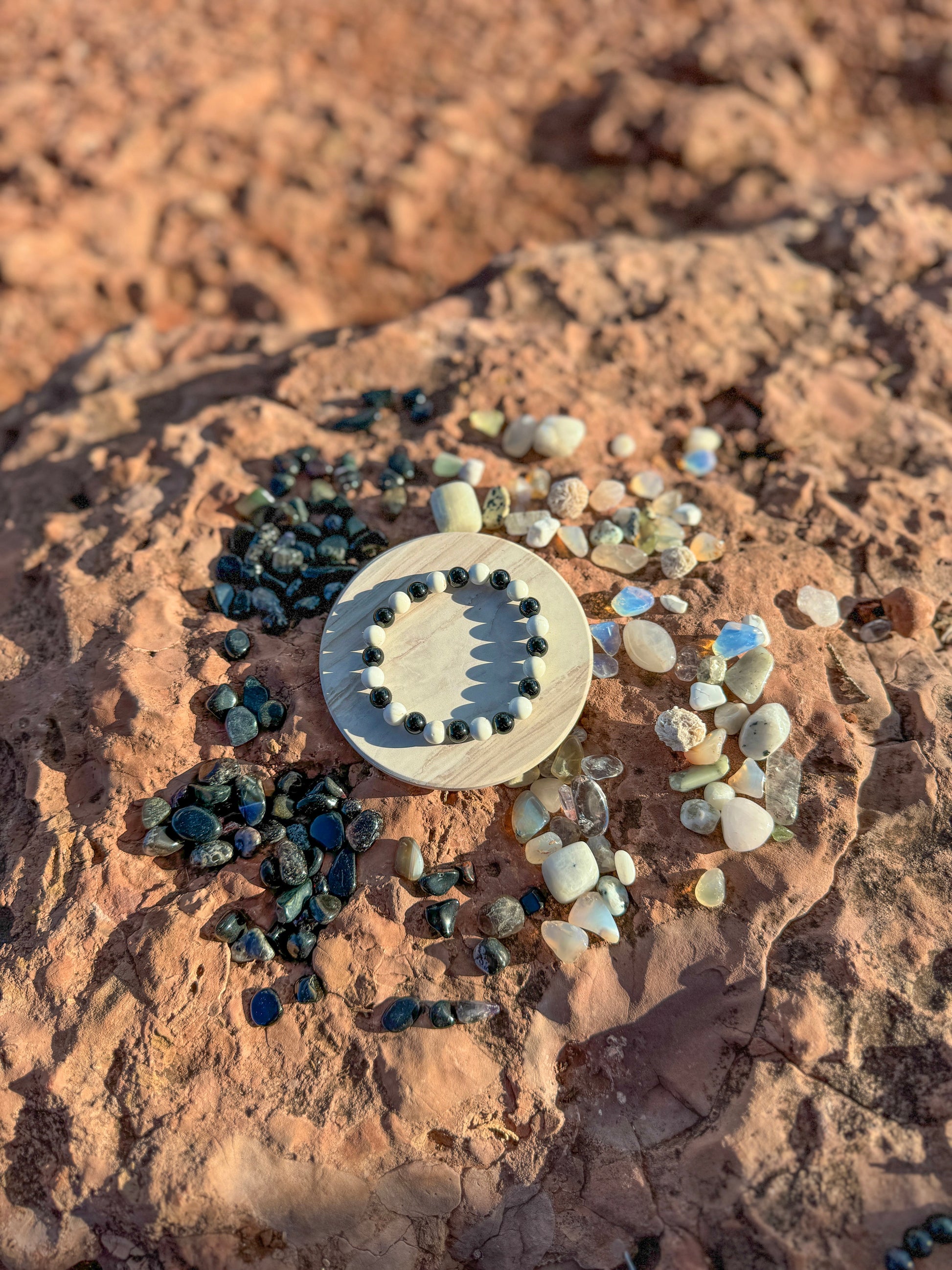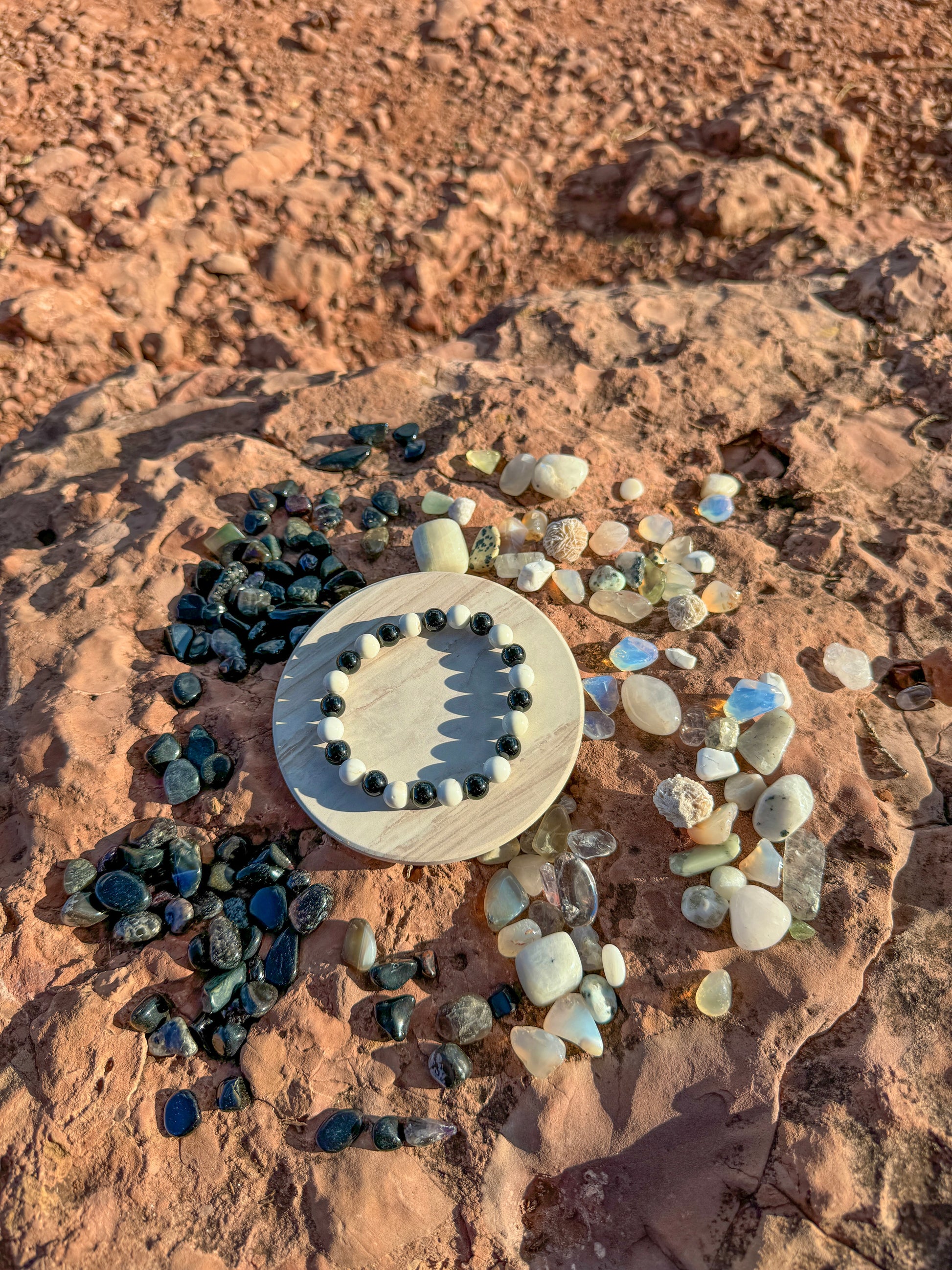 Are you seeking inner peace, emotional stability, and profound resilience? The combination of Howlite and Onyx brings balance, protection, and inner harmony. Howlite provides clarity and emotional balance, while Onyx offers grounding, strength, and protective energy. Wear our handmade Howlite & Onyx healing bracelets to create a centered, resilient, and focused mind.
